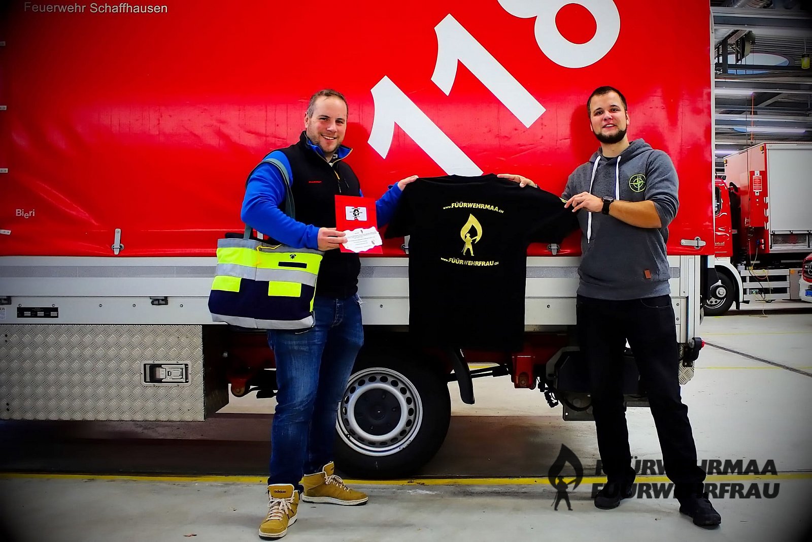 Am 24.12.2019 überreichte Patrick, unser Community-Kommandant, dass FÜÜRWEHRMAA / FÜÜRWEHRFRAU T-Shirt #1 in Gold im Feuerwehrmagazin Schaffhausen seinem neuen Besitzer Kevin.